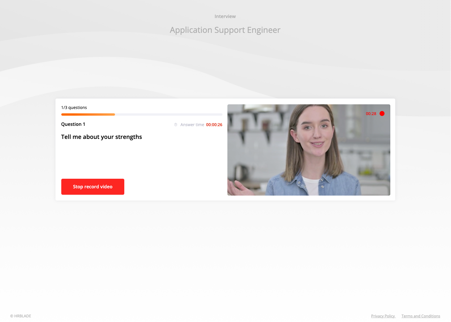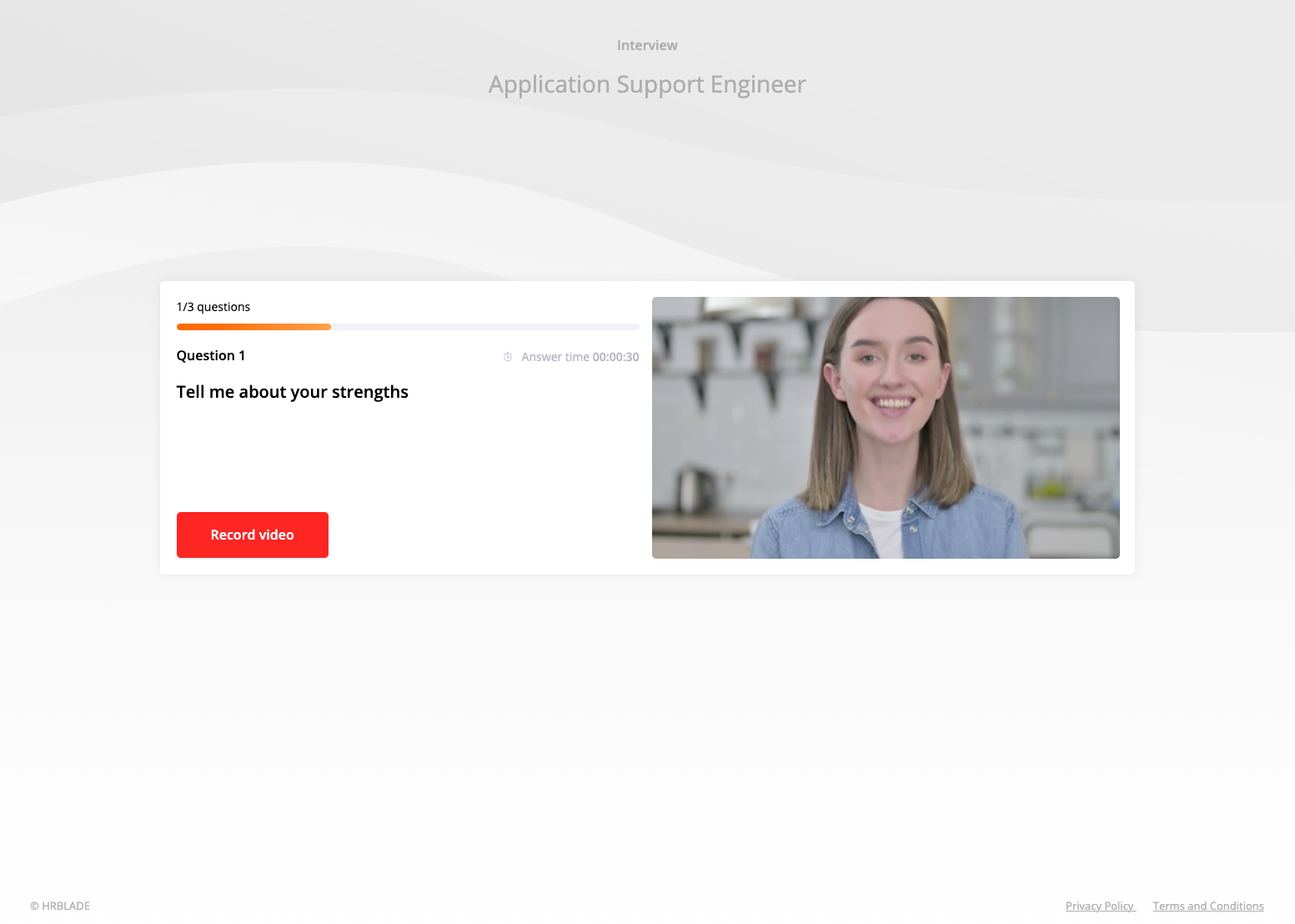 To record the video answers, you will have time to prepare, so take your time. You will see your image on the screen if you allowed the browser to access the camera in the previous step. You can see how you will look in the interview, practice your answer.