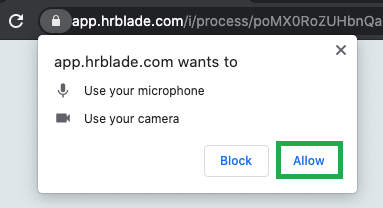 After going to the next page of the interview, the browser will ask you for permission to use the camera and microphone for recording the interview, allow this by clicking the corresponding Allow button.